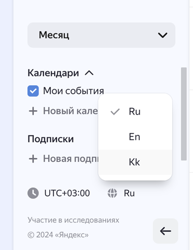 Интерфейс «Календаря» теперь доступен на трех языках. К традиционным русскому и английскому языкам добавили казахский. Изменить настройку можно в левом нижнем углу экрана: иконка для этого находится рядом с обозначением часового пояса. Теперь иностранные пользователи имеют больше возможностей для работы с сервисом на языке, который им удобен.