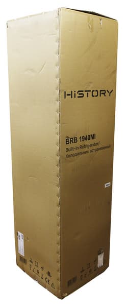 Холодильник HiStory BRB 1940MI прибыл на тестирование в технологической упаковке из коричневого картона, притянутой капроновыми стропами к пенопластовому основанию. Информации на коробке немного: логотип производителя, индекс модели и транспортировочные инструкции.