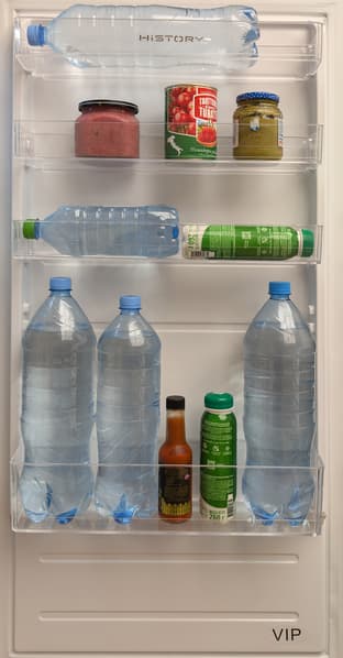 Из четырех полок на дверце возможность регулировки в двух положениях есть только у третьей сверху. Если установить ее в верхнем положении, на нижнюю полку можно поставить до четырех двухлитровых бутылок.