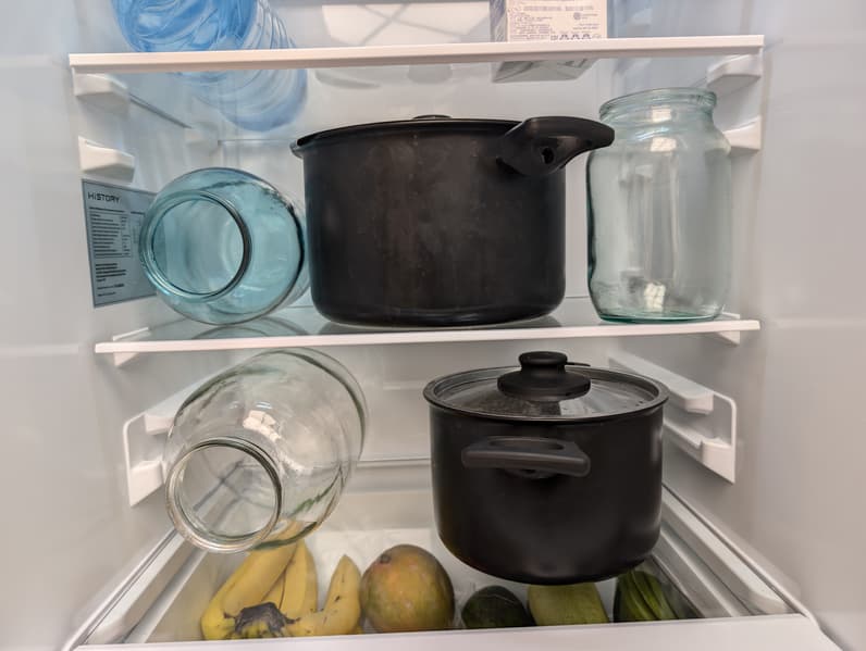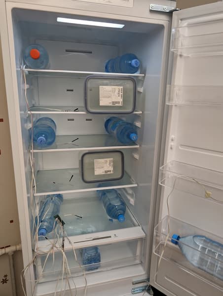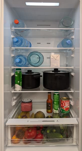 Чтобы имитировать работу загруженного холодильника, в процессе тестирования холодильной камеры мы использовали водяной балласт в таких же четырехлитровых контейнерах, как и при испытании морозилки. Кроме того, на полки и дверцу холодильника положили несколько пластиковых бутылок с водой.