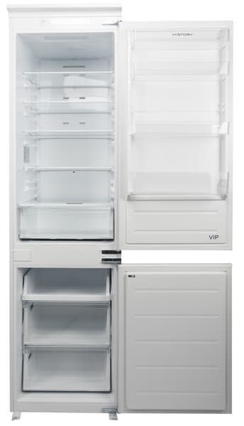 Встраиваемый двухкамерный холодильник HiStory BRB 1940MI понравился нам простотой управления и продуманной организацией пространства холодильной камеры. Возможность гибкой конфигурации полок позволит разместить на них емкости любого размера.