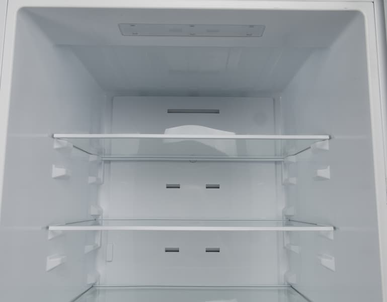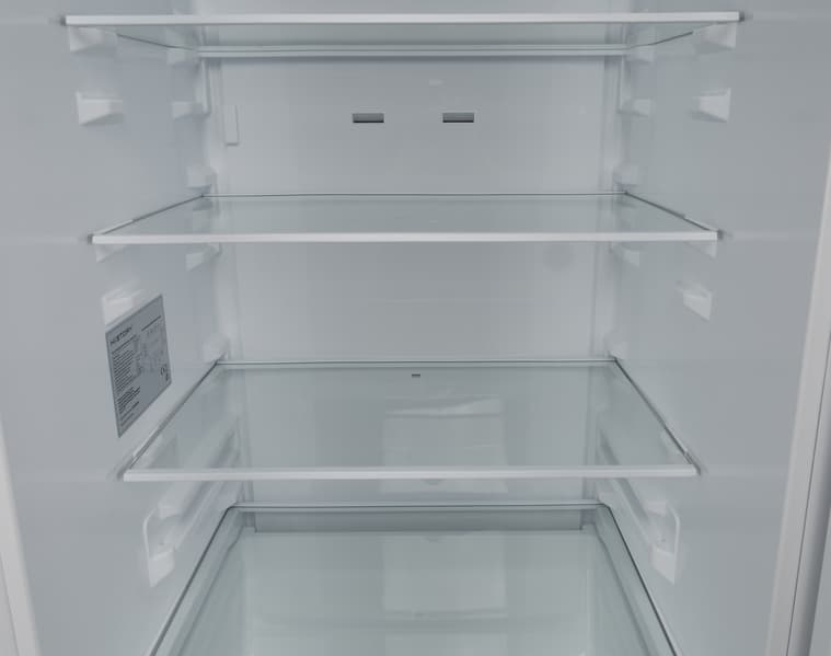 Четыре полки холодильной камеры сделаны из закаленного стекла, способного выдерживать, по словам производителя, до 15 кг, и окантованы пластиком. Конструкция стенок допускает регулировку расположения: для каждой из полок предусмотрено два варианта.