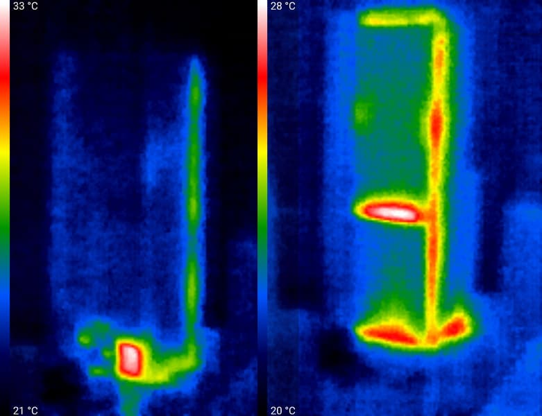 На ИК-фото заметно, что уплотнители дверец холодильного и морозильного отделения подогреваются: такая конструкция высушивает конденсат и исключает обмерзание.