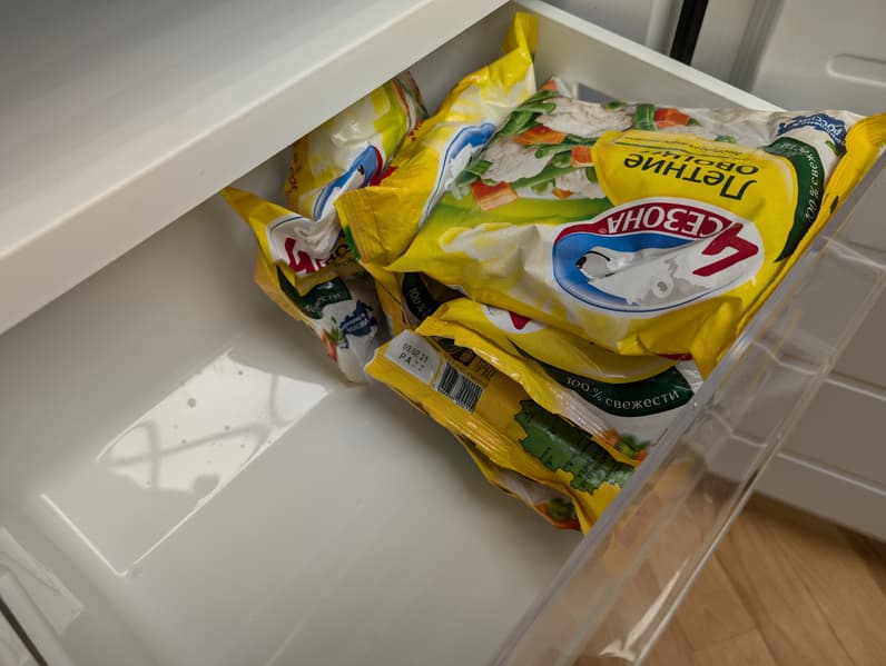 Глубина нижнего ящика заметно меньше из-за ниши холодильного агрегата. В него вмещается только шесть пакетов с овощами.