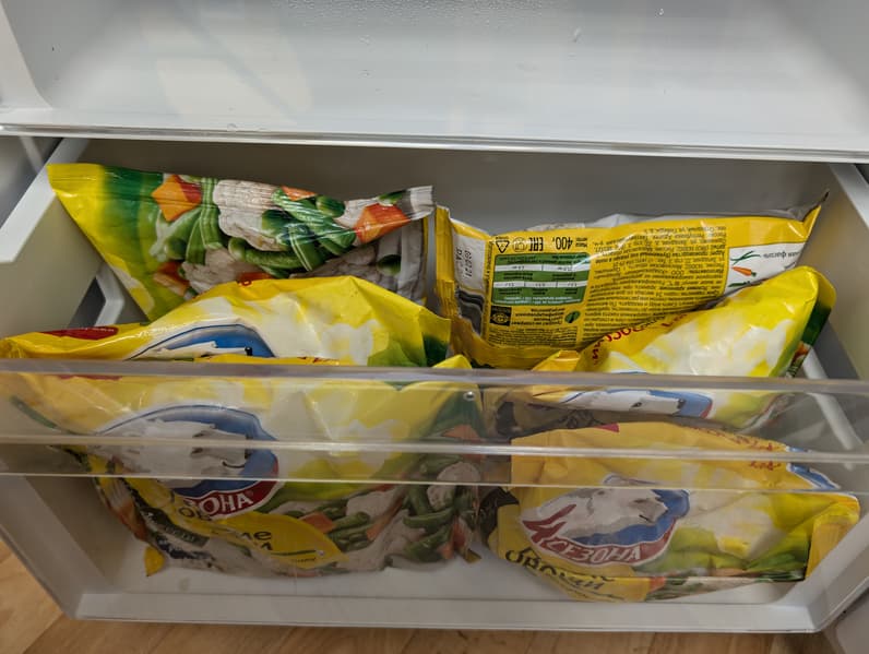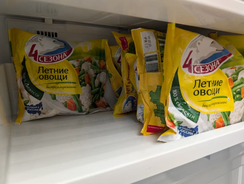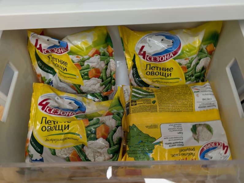 Объем морозильного отделения мы традиционно измеряем стандартными четырехсотграммовыми пакетами с замороженными овощами. На верхней полке легко помещаются десять упаковок: по пять в каждом ряду.