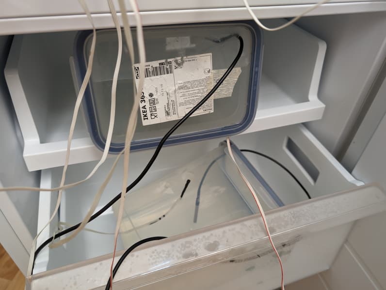 Помимо датчиков температуры воды использовались датчики температуры воздуха. Их мы поместили рядом с контейнерами — так, чтобы поверхность сенсоров не контактировала напрямую с элементами корпуса морозильной камеры.