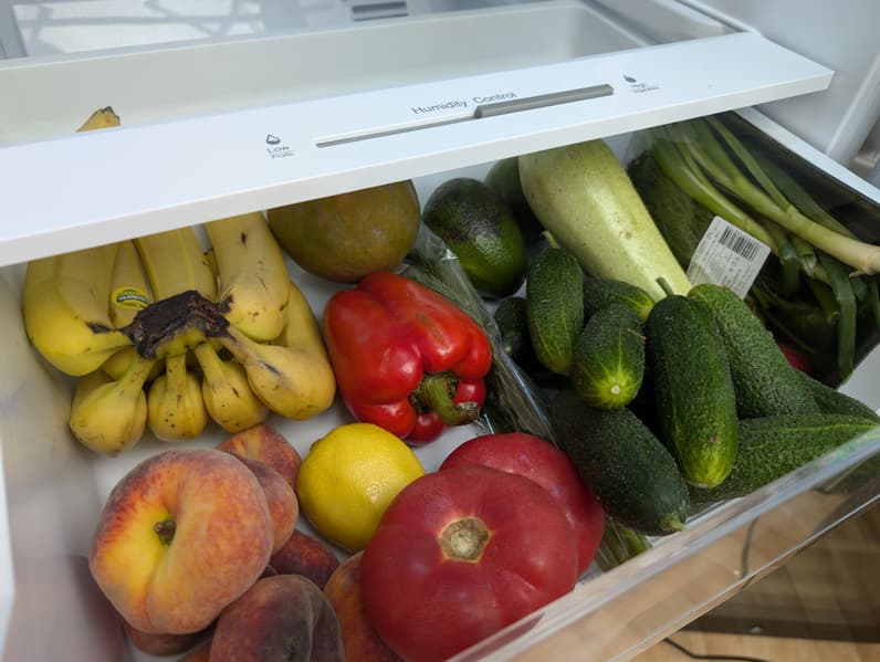 Емкость зоны свежести достаточна для того, чтобы хранить в ней большой объем свежих овощей и фруктов. Слайдер, управляющий влажностью, позволяет установить в ней правильный микроклимат. К сожалению, в ящике нет каких-либо разделителей и перегородок — пользователь должен выбрать оптимальное положение заслонки для всего ящика.