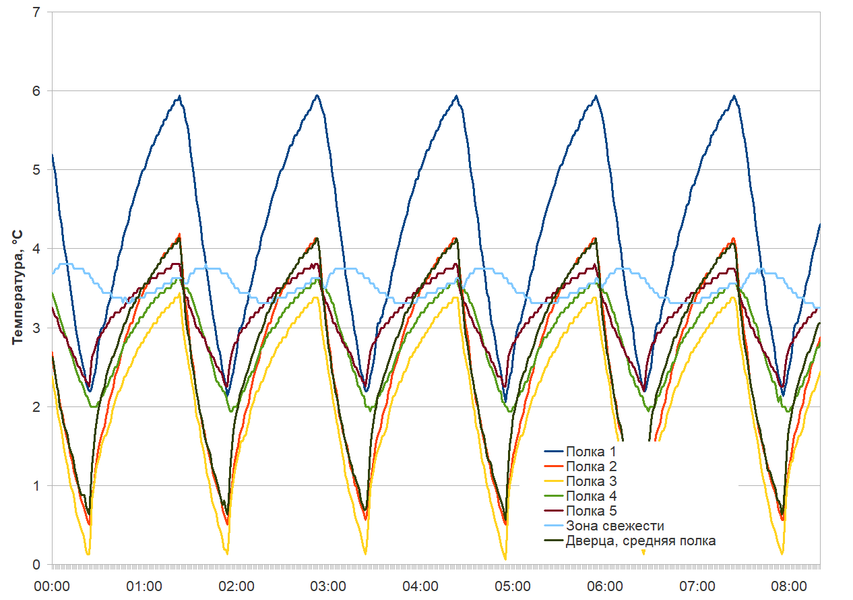 На графике можно видеть, что во всех точках измерения температура колеблется с периодом около полутора часов, понижаясь при включении компрессора и плавно повышаясь после его отключения. Микроклимат зоны свежести более ровный. Ящик холодильного отделения не так интенсивно вентилируется, поэтому в ней меньше перепадов влажности и температуры, что позволяет сохранять мясо, зелень и фрукты свежими.