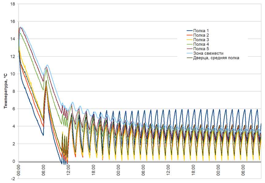 Считаем необходимым еще раз подчеркнуть, что приведенные графики иллюстрируют не потребительские качества холодильника, а особенности логики работы холодильного агрегата и циркуляции холодного воздуха между зонами камеры. Не следует удивляться таким, на первый взгляд, существенным колебаниям: охлажденные продукты обладают значительно большей тепловой инерцией, нежели воздух в камере, и переносят циклические изменения температуры нормально.