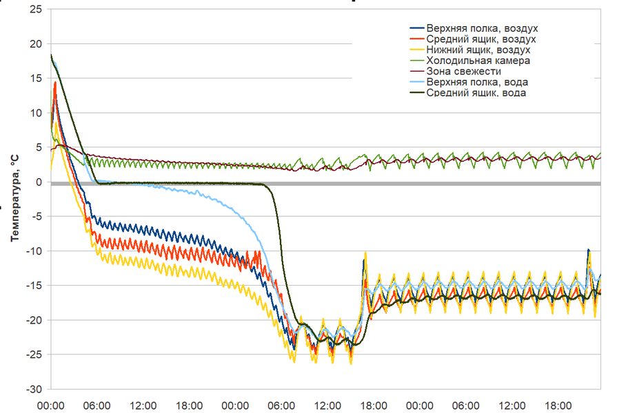 Чтобы оценить замораживающую способность холодильника, мы поместили контейнеры с водой комнатной температуры на верхнюю полку и в средний ящик морозильной камеры, после чего включили режим суперзаморозки. Результаты измерений температуры воды и воздуха можно видеть на графике ниже.