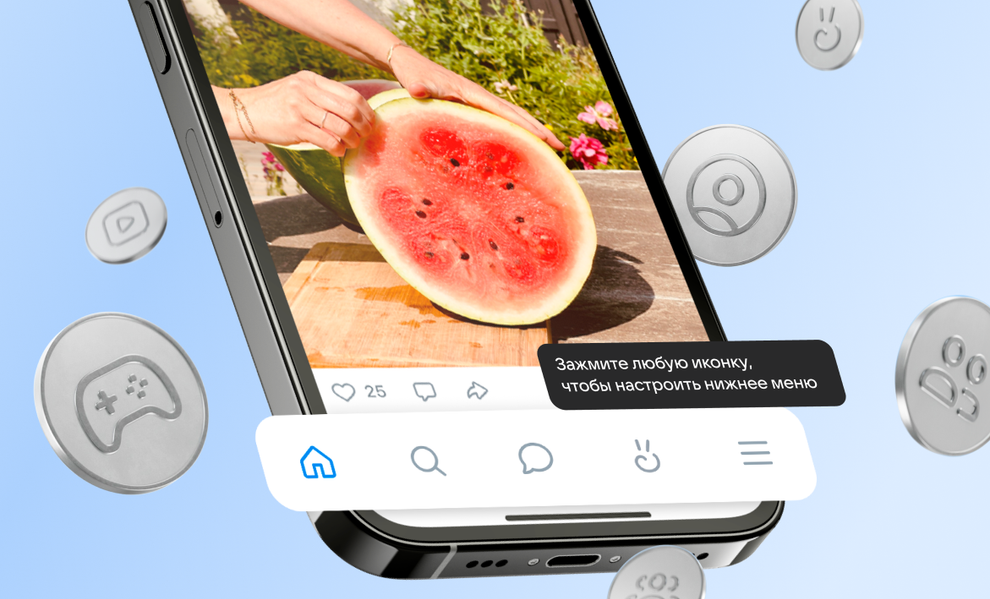 Алгоритмы машинного обучения предлагают разделы с учётом активности и интересов. Можно выбрать предложенный вариант или настроить навигационные вкладки по своему усмотрению: добавить переход к профилю, сообществам, друзьям, играм, в «VK Клипы» или «VK Музыку». Самые востребованные среди аудитории разделы доступны всегда: по итогам исследований, ими стали лента, поиск с рекомендациями и «VK Мессенджер».