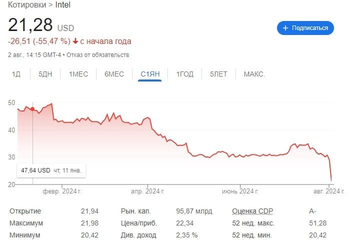 Акции рухнули на 28%, опустившись в пике ниже отметки в 21 доллар. Сейчас они торгуются по цене около 21 доллара, и откуп не наблюдается. Капитализация Intel упала ниже 100 млрд долларов. Для сравнения, капитализация AMD сейчас — 234 млрд долларов.