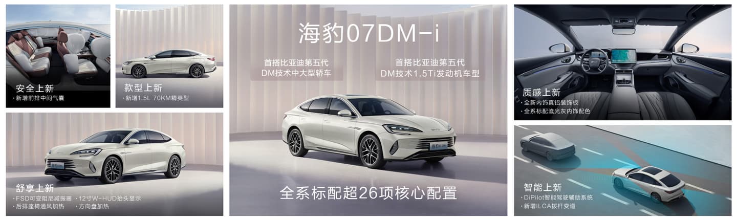 В оснащении BYD Seal 07 DM-I подогрев руля, подогрев и вентиляция не только передних кресел, но и заднего сиденья. Цифровая приборная панель (с экраном диагональю 8,8 или 10,25 дюйма), медиасистема (с экраном диагональю 12,8 или 15,6 дюйма), различные системы помощи водителю, 13 подушек безопасности. Стоимость BYD Seal 07 DM-i находится в диапазоне от 19,5 до 27,3 тыс. долларов.