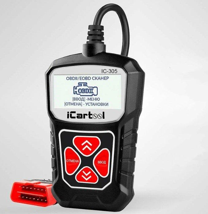 Среди простых и недорогих моделей можно выделить iCarTool IC-305 — доступный автосканер с дисплеем, который подходит для быстрой диагностики автомобиля. Он не требует для своей работы аккумуляторных батарей или других элементов питания, так как питается непосредственно от самого диагностического разъема. Такой сканер позволяет выполнять функции поиска и считывания ошибок, расшифровки DTC-кодов неисправностей, а также дает возможность выполнить стирание кодов ошибок ЭБУ.