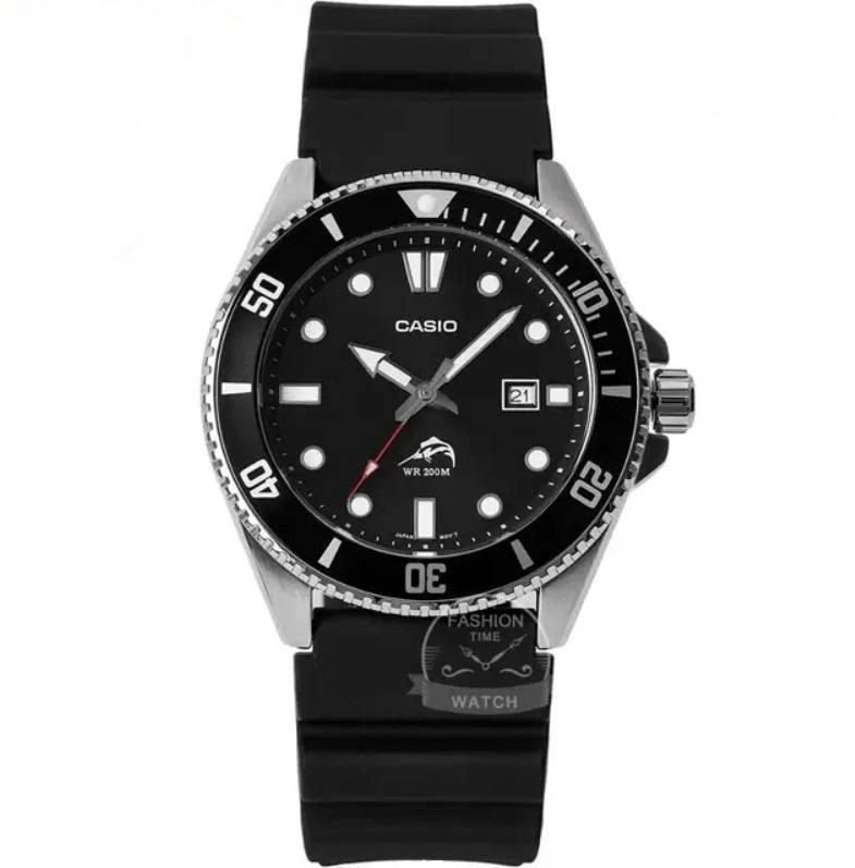 Еще одна модель от бренда Casio, однако корпус этого варианта выполнен уже из нержавеющей стали, а ремешок из канифоля. Для производства окошка использовался хардлекс. Часы рассчитаны для погружения под воду на глубину до 200 метров.