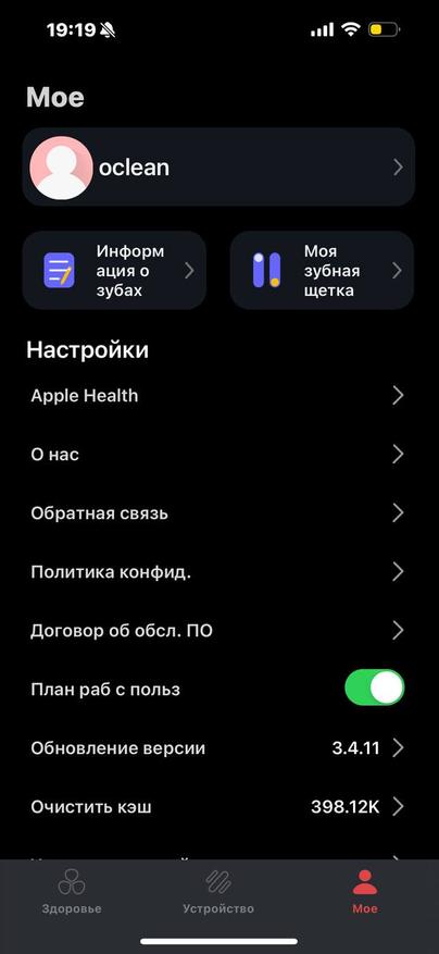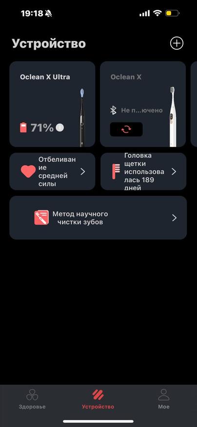 После установки собственного приложения Oclean появится меню на русском языке. Отмечу, что перевод не самый совершенный. В приложении доступно пять режимов чистки: эксклюзивный (который вы выставляете сами), отбеливание, бережная чистка дёсен, ночная и утренняя чистка. Гаджет предлагает чистить зубы пять раз в день. В Китае у многих это уже является нормой.