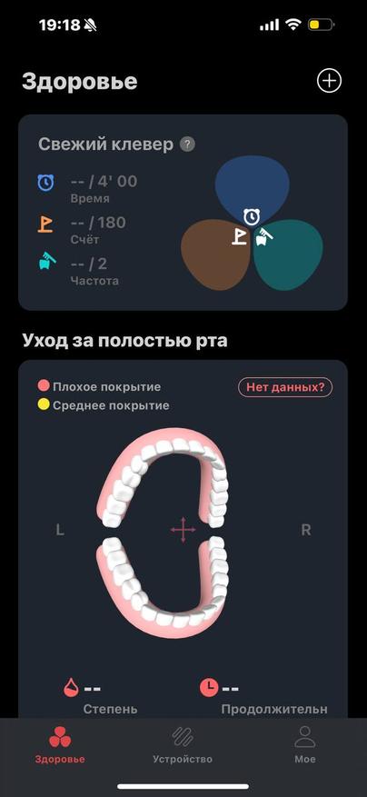 Интерфейс интуитивно понятен и предоставляет визуализацию в виде лепестков-клевера. Каждый лепесток отображает разные параметры: время чистки, балл за качество чистки и частоту чистки. Приложение также даёт рекомендации для улучшения вашей техники чистки. Гаджет показывает время, погоду и отображает сопряжение с Wi-Fi.