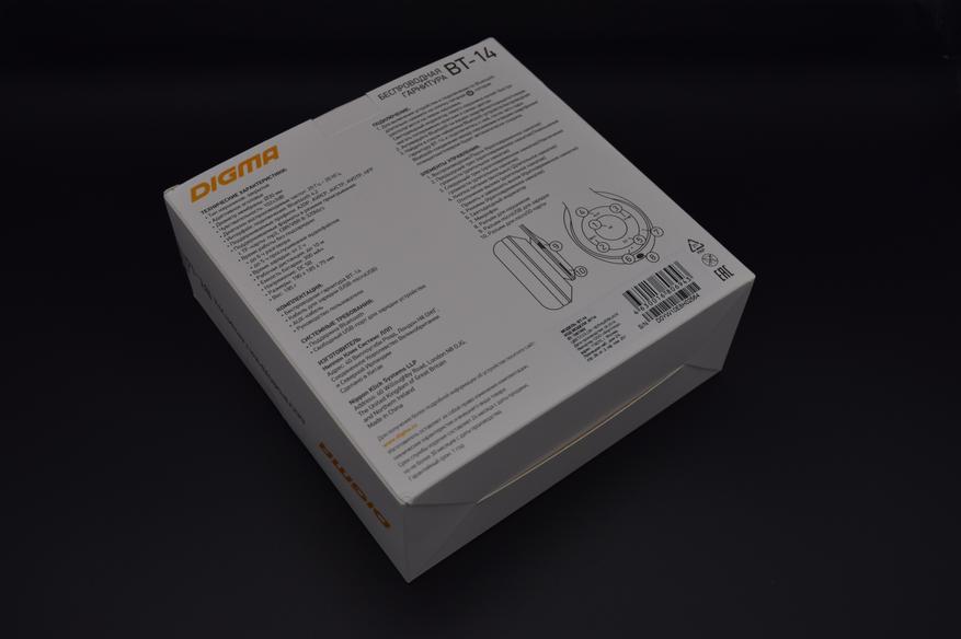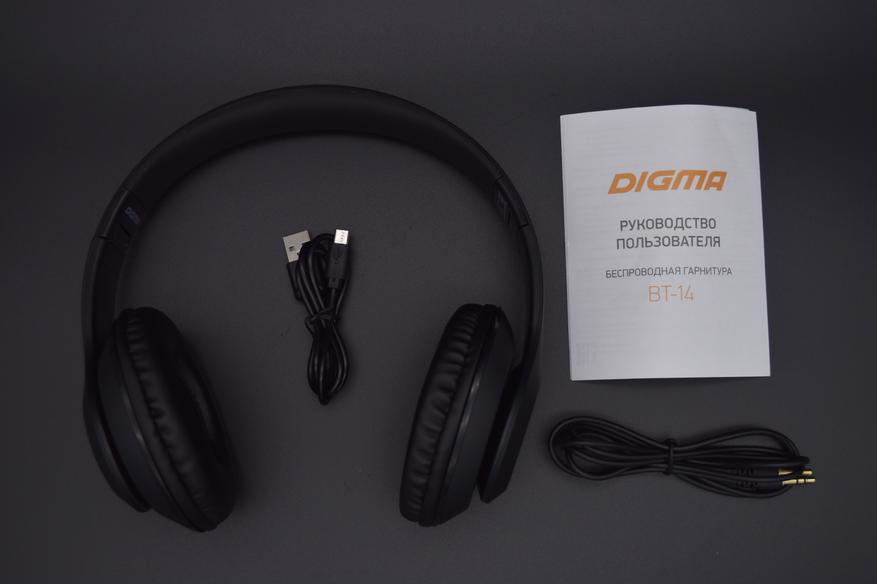 Гарнитура поставляется в картонной упаковке с простым, но понятным фирменным оформлением Digma. В комплекте помимо самой гарнитуры в коробке можно найти кабель для зарядки (USB — microUSB), аудио-кабель со штекерами mini-Jack 3,5mm и небольшое руководство пользователя.