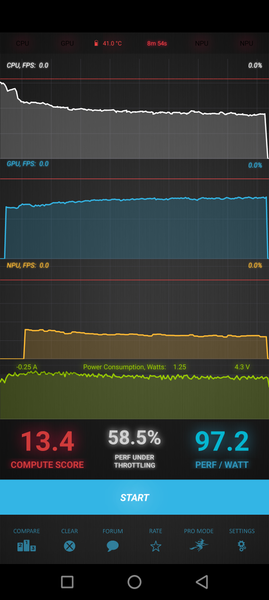 Тест на снижение производительности при нагреве мы проводим с помощью программы Burnout Benchmark, которая позволяет нагружать CPU, GPU и NPU: