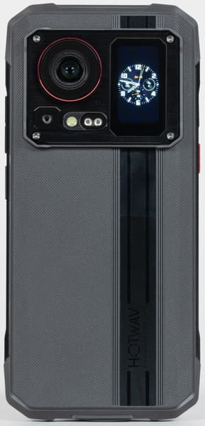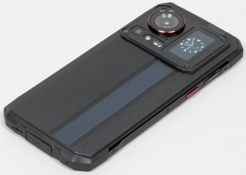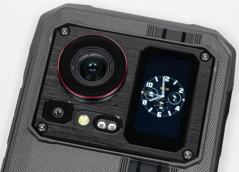 Сзади в едином блоке, тоже зачем-то прикрученном винтиками, помимо основной и дополнительной камеры со вспышкой расположен также дополнительный сенсорный экран — цветной и с собственным набором циферблатов. Он отображает входящие уведомления о звонках и сообщениях из приложений вроде WhatsApp и Telegram, предоставляет быстрый доступ к функциям управления камерой и музыкальными приложениями. Также он может демонстрировать информацию о заряде батареи и количестве пройденных шагов. Официально для этого экрана заявлено разрешение 240×240, хотя хорошо видно, что на самом деле он сильно вытянутый.
