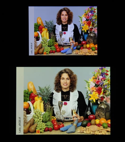 Цвета чуть перенасыщенные, цветовой баланс у экранов различается, картинка на смартфоне явно затемнена. Напомним, что фотография не может служить надежным источником сведений о качестве цветопередачи и приводится только для условной наглядной иллюстрации. Причина в том, что спектральная чувствительность матрицы фотоаппарата неточно совпадает с этой характеристикой человеческого зрения.