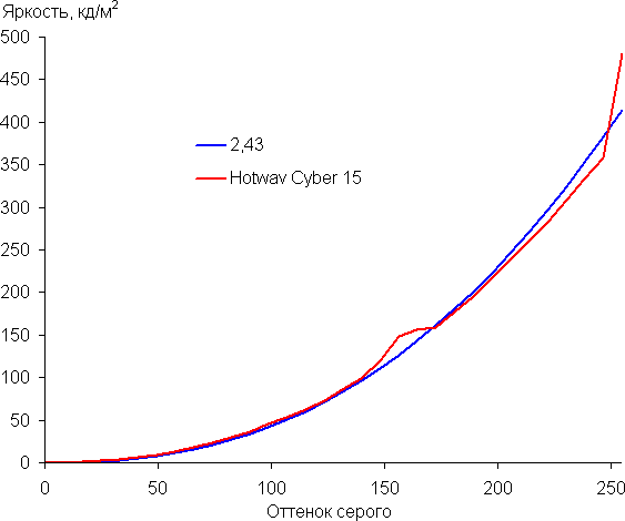 Контрастность (примерно в центре экрана) высокая — порядка 1300:1. Время отклика при переходе черный-белый-черный равно 19 мс (10 мс вкл. + 9 мс выкл.). Переход между полутонами серого 25% и 75% (по численному значению цвета) и обратно в сумме занимает 29 мс. Построенная по 32 точкам с равным интервалом по численному значению оттенка серого гамма-кривая не выявила завала ни в светах, ни в тенях. Показатель аппроксимирующей степенной функции равен 2,43, что выше стандартного значения 2,2. При этом реальная гамма-кривая существенно отклоняется от степенной зависимости: