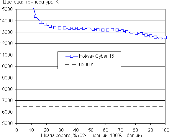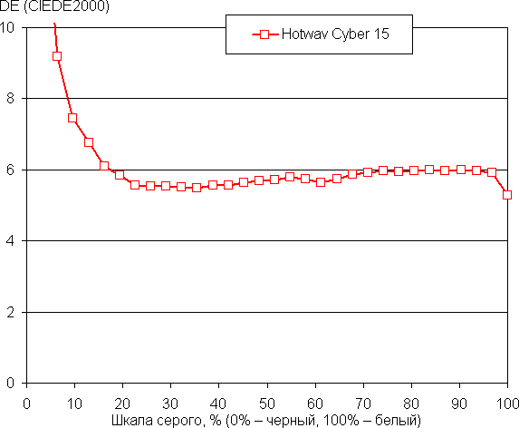 Баланс оттенков на шкале серого средний, так как цветовая температура существенно выше стандартных 6500 К, но отклонение от спектра абсолютно черного тела (ΔE) относительно невысокое, ниже 10 единиц. Впрочем цветовая температура и ΔE мало изменяются от оттенка к оттенку — это положительно сказывается на визуальной оценке цветового баланса. (Самые темные области шкалы серого можно не учитывать, так как там баланс цветов не имеет большого значения, да и погрешность измерений цветовых характеристик на низкой яркости большая.)