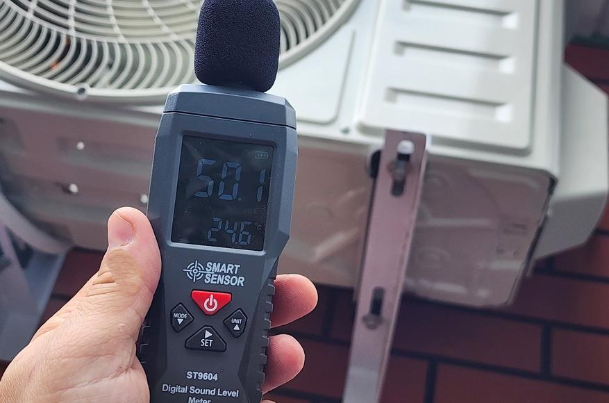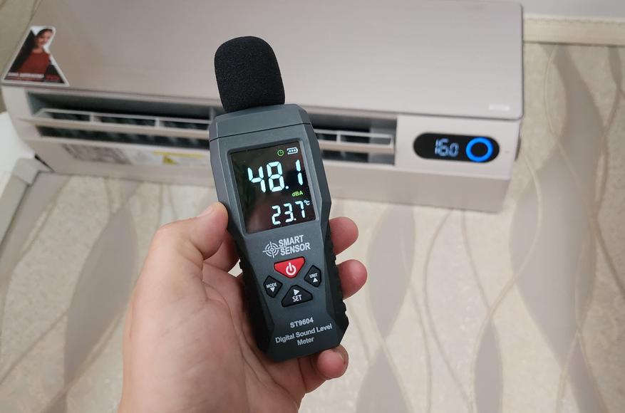 Производитель заявляет минимальный уровень шума в районе 22 дБ. Проверил, действительно, если установить экономичный режим работы и самую первую «скорость» обдува, то получим 22-23 дБ в метре от внутреннего блока. Вполне можно спать при постоянном включенной сплит-системе. Конечно, в режиме быстрого охлаждения (Турбо — 7 скорость) шум от вентиляции может достигать 47-48 дБ. Внешний блок шумит в пределах 50-52 дБ. Если сделали виброразвязку, то по стене низкочастотная вибрация передаваться уже не будет, но будет только шум от лопастей при работе. Стоит отметить, что в помещении через стенку внешний блок практически не слышно (нужно прислушиваться во время его работы).