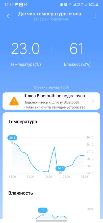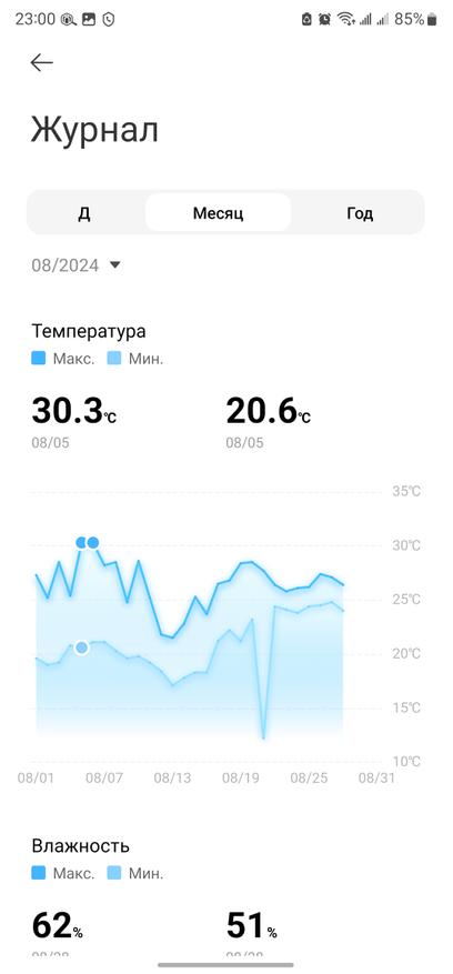 Для оценки скорости охлаждения прикладываю графики с термометра-гигрометра для умного дома. Обратите внимание на среднюю температуру в помещении около 28-30 градусов, а также быстрое охлаждение до 23-24 градусов при работе сплит-системы. При необходимости можно активировать и режим «Осушение», удаляя избыточную влажность из помещения.