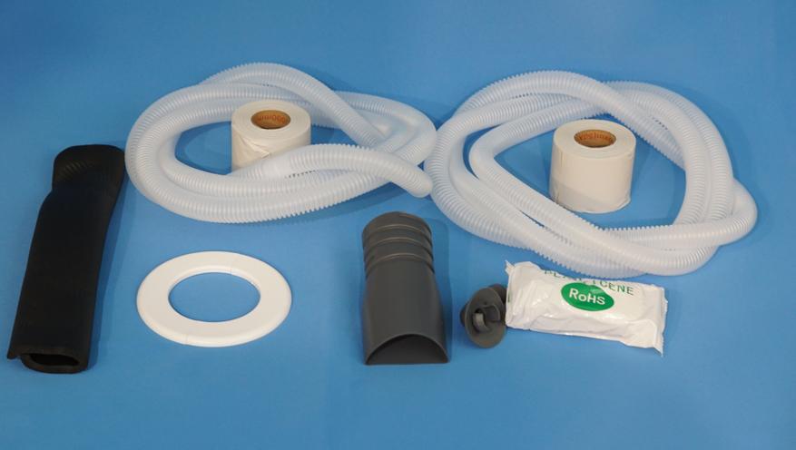 Используется пластиковая трубка, около двух метров есть в комплекте + круглый короб для прохода воздуховода через стену (есть на фотографиях в начале).