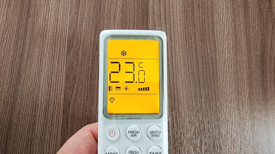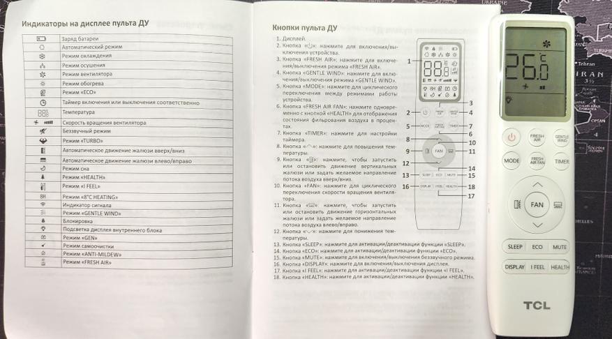 Пульт от сплит-системы TCL понравился. Он больше и удобнее, чем большинство типовых моделей. Для быстрого доступа к функциям предусмотрены отдельные кнопки. Отмечу функции IFeel, Health, Gentle Wind. Функция IFeel позволяет контролировать температуру воздуха с высокой точностью, обеспечивая комфортное окружение в любое время года. Особенность данной функции заключается в месте размещения сенсора температуры — в самом пульте ДУ. Пульт можно положить рядом с собой, тогда контроль будет осуществляться на основании показателей воздуха рядом с вами. Функция Health — это активация встроенного ионизатора для дополнительной обработки воздуха. Функция Gentle Wind позволяет имитировать легкий ветерок по всей комнате с помощью специфического качания лопастей. Больше информации можно почерпнуть из инструкции к TCL — на русском языке довольно подробно приводятся расшифровки всех функций и режимов работы.