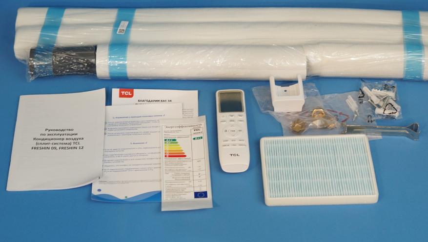 Сплит-систему подбирал для личного использования, в небольшой комнате (около 22 кв. метра) для комфортной работы (компьютер, телевизор, фотозона и обычно бывает 1-2 человека). Искал именно экономичный и тихий вариант, одновременно позволяющий включать и настраивать режимы удаленно через приложение. Кондиционер TCL FRESHIN 09 —это именно такой вариант. Комплект сплит-системы состоит из двух коробок, внутри которых находятся не только основные блоки (внешний и внутренний), но и все необходимое для установки и настройки.