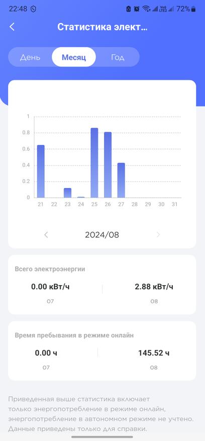 Стоит отметить, что в приложении для смартфона имеются и ряд дополнительных функций. Например, функция самоочистки. При активации кондиционер начинает в течение получаса выполнять манипуляции, связанные с поочередным нагревом и охлаждением теплообменников. Производитель рекомендует активировать самоочистку каждые три месяца. Но данная функция не избавляет пользователя от периодической замены HEPA-фильтра. Отмечу возможность адаптирования работы кондиционера от электрогенератора. В приложении можно выбрать ограничения, позволяющие полноценно работать с нестабильной энергией от генератора. Есть и смарт-контроль энергопотребления. Пользователь имеет возможность проверить потребление по дням и посмотреть статистику за, например, месяц.