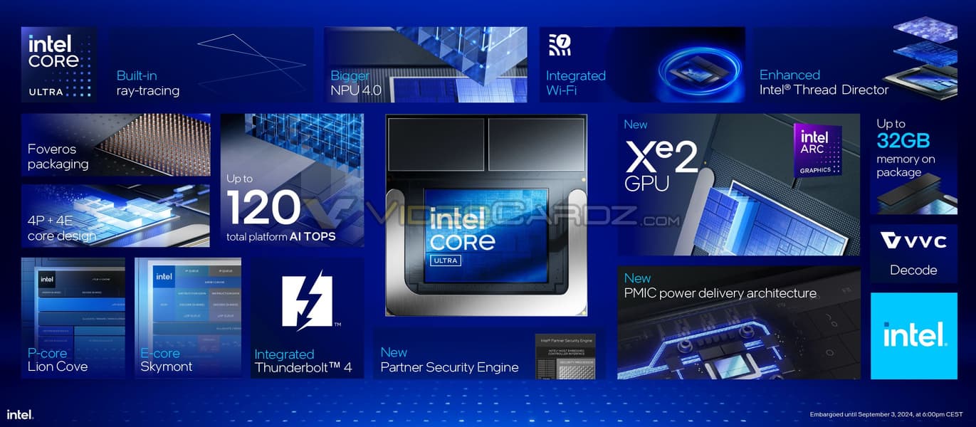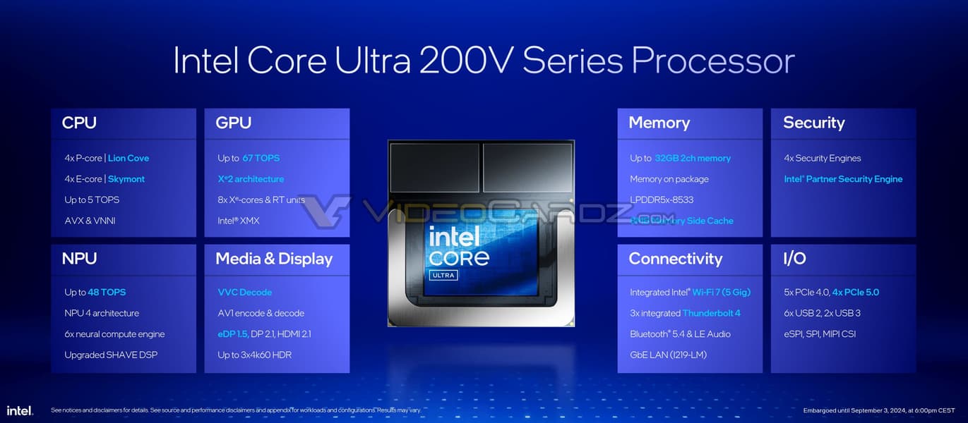 Есть у Lunar Lake и мощный блок NPU — на 40-48 TOPS. Это позволяет процессорам соответствовать требованиям для категории Copilot+ PC. Также можно отметить контроллер Thunderbolt 4, хотя Thunderbolt 5 была представлена год назад, технологию объёмной компоновки Intel Foveros, которая используется при производстве, контроллер Wi-Fi 7. Ноутбуки на основе Lunar Lake будут представлены уже сегодня, а в продаже появятся 24 сентября.