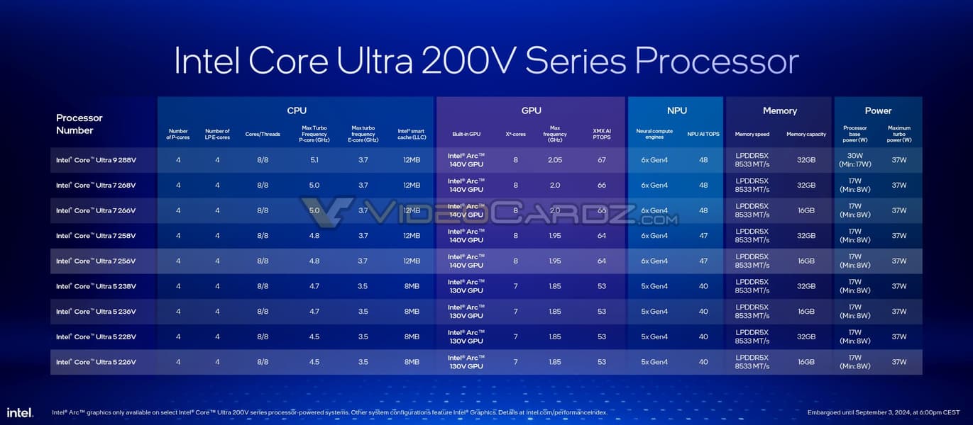 Отличаются частотами процессорной части, графическим ядром и объёмом оперативной памяти, которая тут, также впервые для Intel, расположена на одной подложке с самим процессором. То есть фактически у нас есть четыре пары моделей, которые между собой в каждой паре отличаются только объёмом ОЗУ, и один топовый Core Ultra 9, у которого нет версии с 16 ГБ.