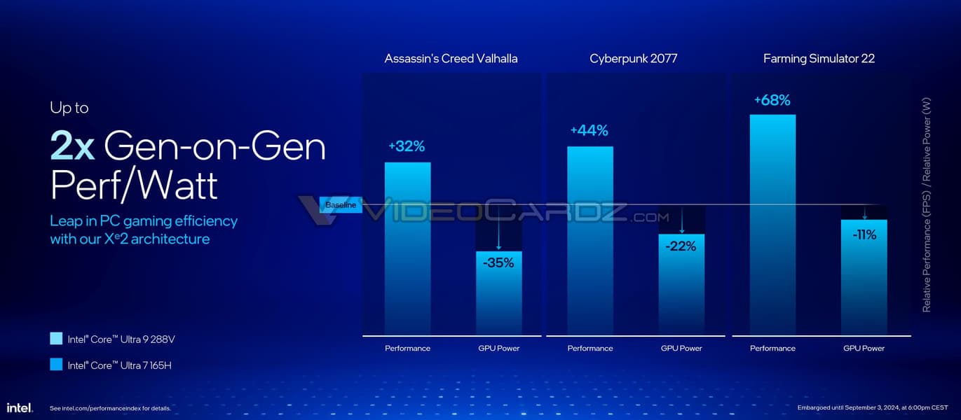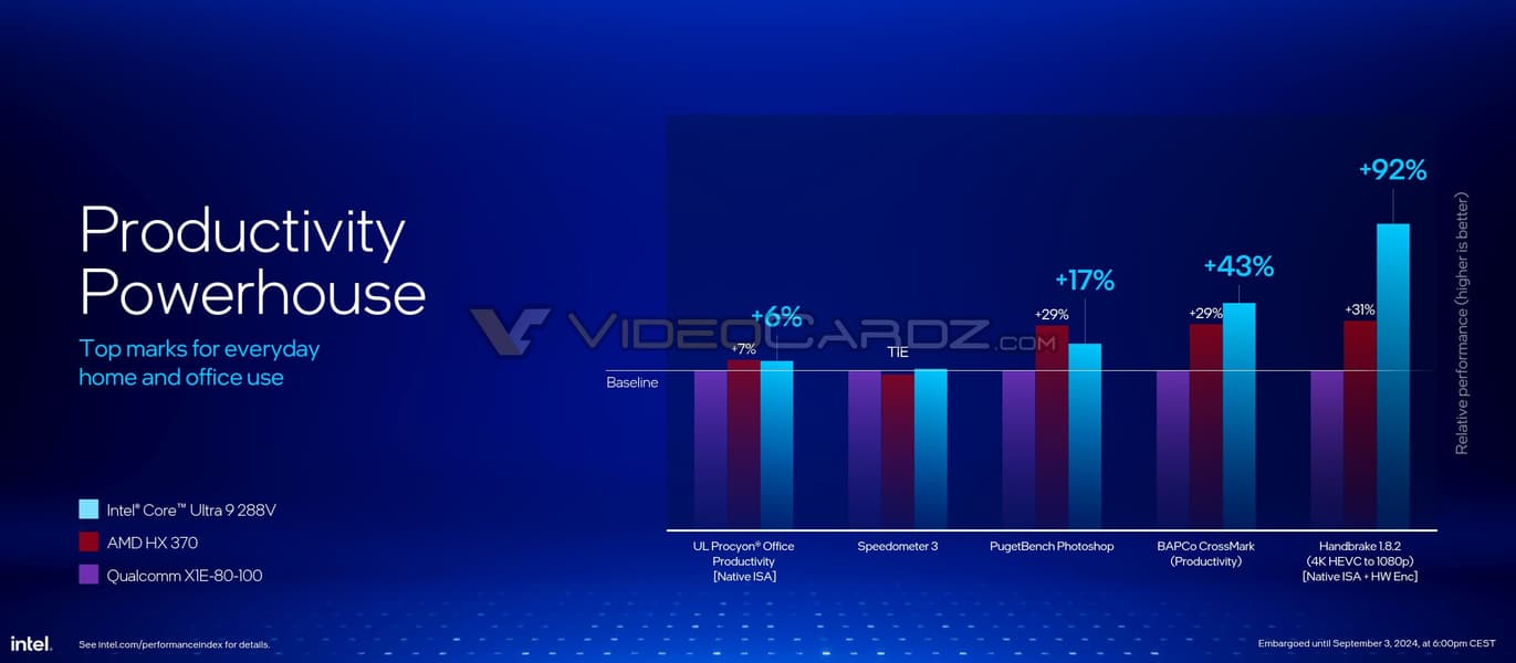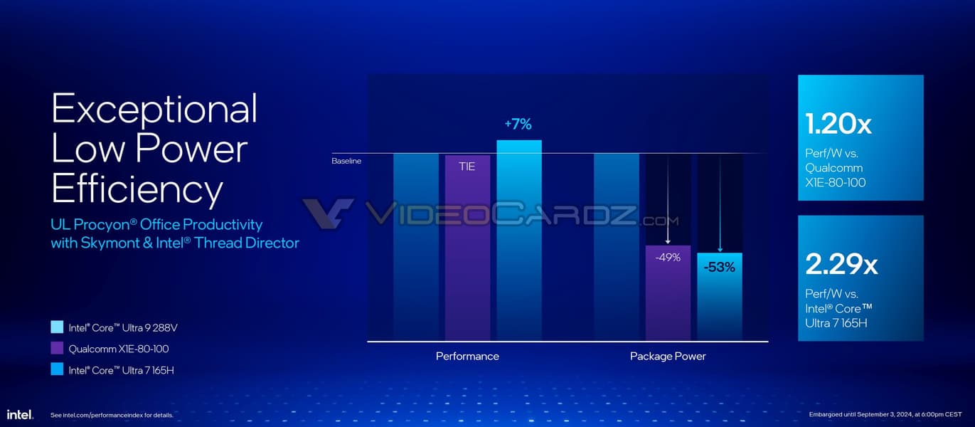 Правда, Intel делает упор на однопоточную производительность, так как она очень хороша, но примеры с приложениями показывают, что как минимум Core Ultra 9 288V будет чуть быстрее Core Ultra 7 165H при более чем вдвое меньшем энергопотреблении. Что интересно, по энергоэффективности CPU Intel должен быть лучше новых Snapdragon X Elite, и это топовый 30-ваттный процессор, а 17-ваттные должны быть ещё лучше.