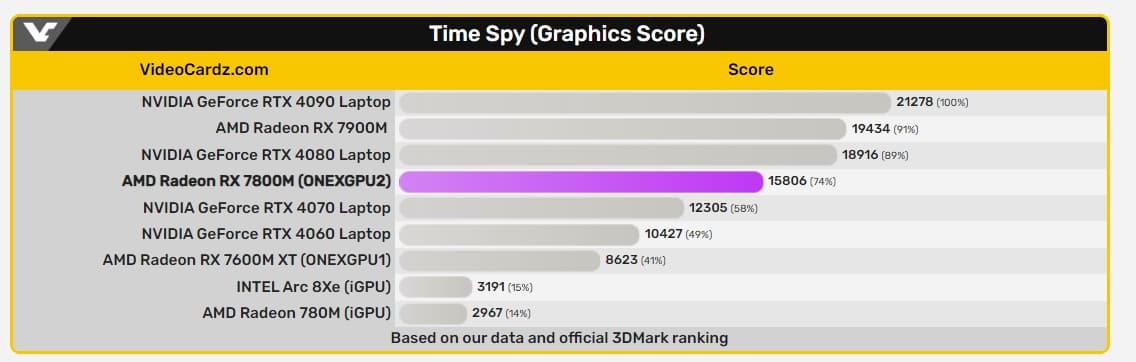 Пока что есть результат только в 3DMark Time Spy — 15 806 баллов. Это немало. Для сравнения, RTX 4070 Laptop набирает около 12 300 баллов, а RTX 4080 Laptop — 18 900 баллов. То есть результат новинки AMD где-то посередине. Мобильная RX 7900M показывает результат почти 19 500 баллов.