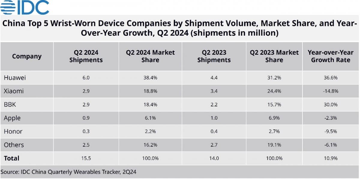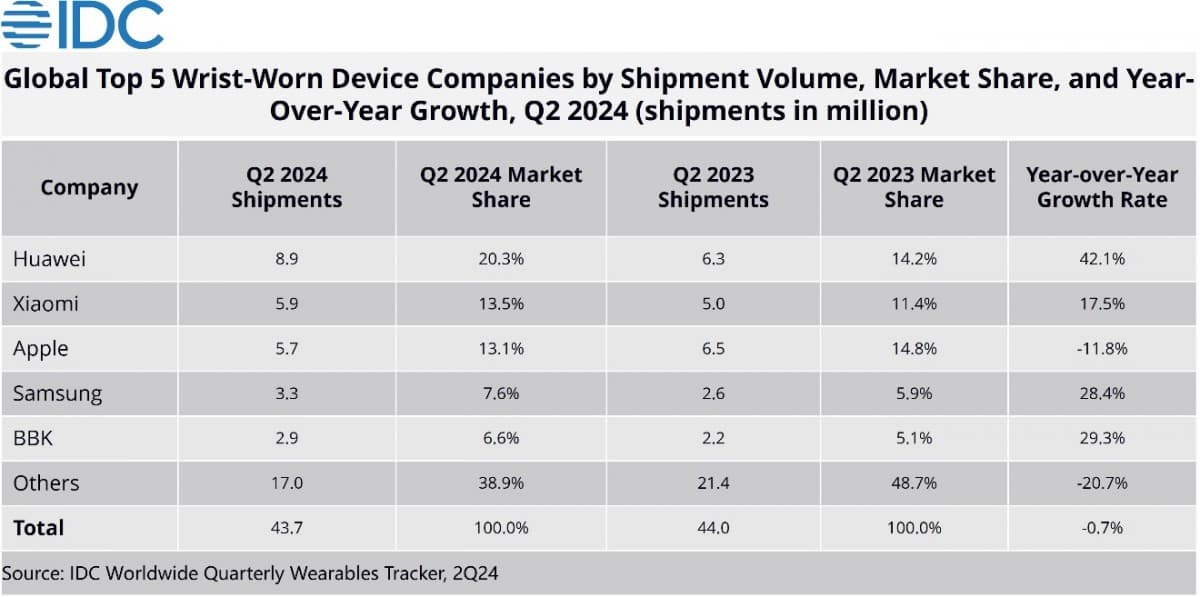 Apple опустилась сразу на третье место с долей 13,1% и 5,7 млн проданных устройств, а второе заняла Xiaomi, продажи которой выросли на 17,5%. Далее разместились Samsung и BBK. К слову, Apple оказалась единственной в пятёрке лидеров, у кого продажи за год упали. Правда, стоит помнить, что Apple при этом и единственная в списке, кто выпускает исключительно полноценные умные часы, причём довольно недешёвые. Остальные компании производят в том числе обычные трекеры активности.