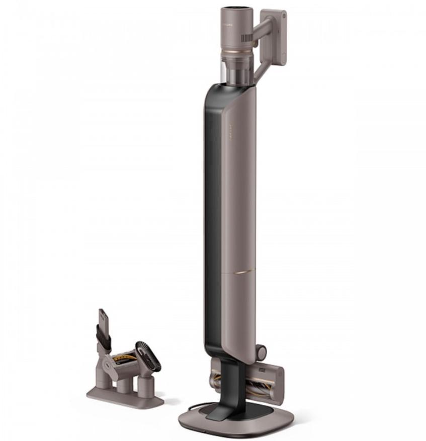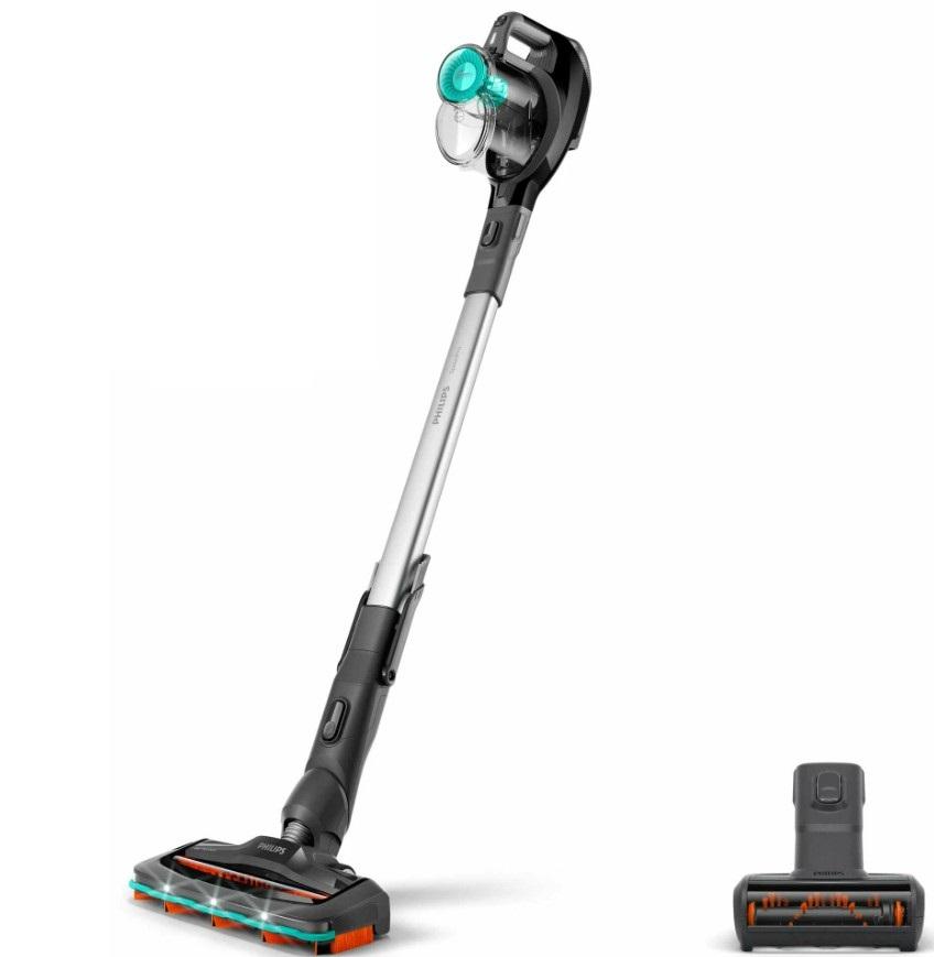 Бренд Philips предлагает достаточно оригинальную модель вертикального пылесоса с аккумулятором, который отличается своей неординарной конструкцией: резервуар для мусора размещается не под ручкой, а над ней. Также отмечу нешаблонный дизайн в оформлении как самого корпуса пылесоса, так и турбо-насадок. Пылесос оснащается подсветкой рабочей зоны, а конфигурация шарнира в основании насадки позволяет вращать туда-сюда без лишних усилий, собирая больше пыли за один раз. Есть и минусы — за счет уменьшенного объема пылесборника такой пылесос придется чаще очищать, особенно при уборке помещений большой площади. Зато сам мусор делится в двух зонах резервуара: крупный мусор остается в первой камере, мелкий — во второй циклонной камере.