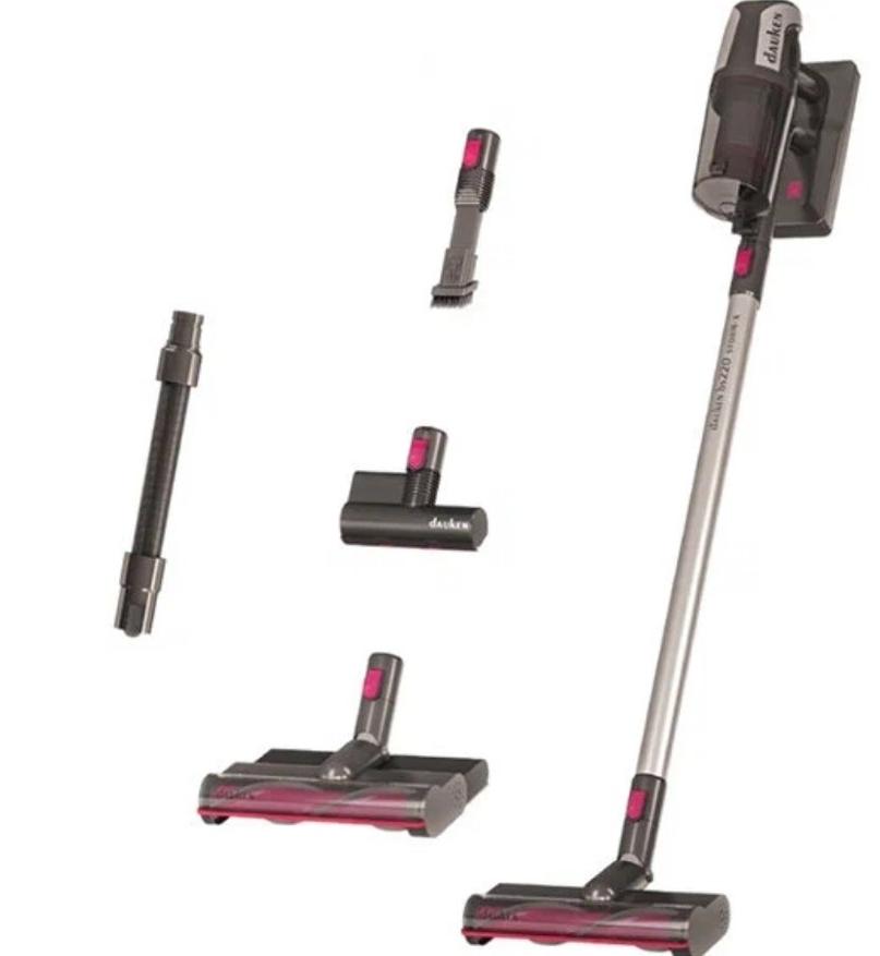 Более простым и дешевым вариантом предыдущей модели может служить вертикальный пылесос с аккумуляторным питанием от бренда Dauken. Полное наименование: Dauken BS220 STORM WATER PRO. Модель также оснащается сменной насадкой для влажной уборки. Из особенностей отмечу продвинутую систему фильтрации (5 ступеней, включая фильтры HEPA), а также наличие гибкого колена в комплекте, что позволяет проводить уборку под мебелью, а также в таких местах, куда сложно добраться прямой насадкой.