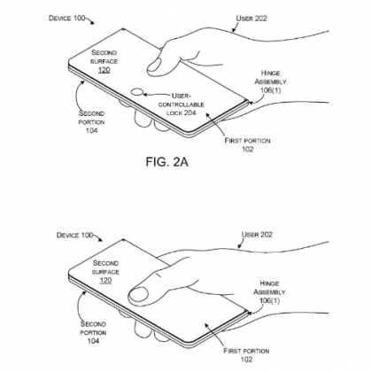 Недавно в Сети появились изображения из нового патента, зарегистрированного Microsoft, в котором описывается мобильное устройство со сгибающимся пополам дисплеем. Помимо шарнирной части, смартфон оснащен кнопкой блокировки открытия, которая будет полезна для тех случаев, когда смартфон большую часть времени будет использоваться в сложенном состоянии.