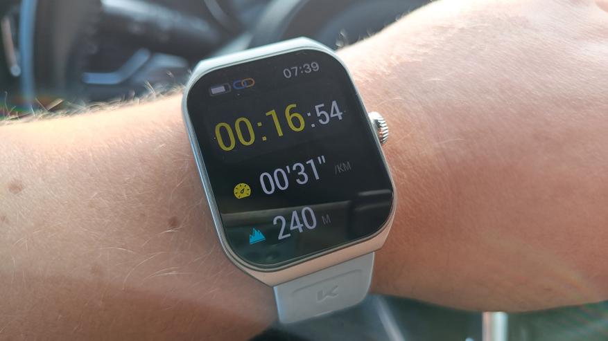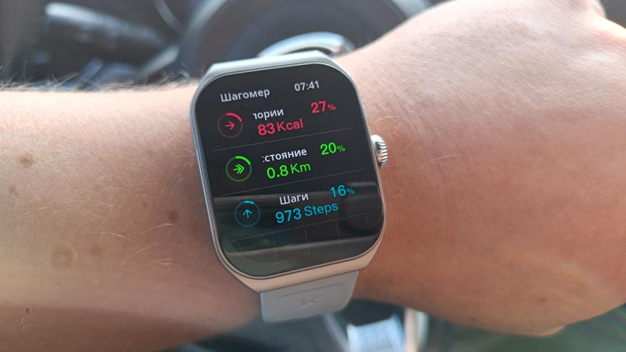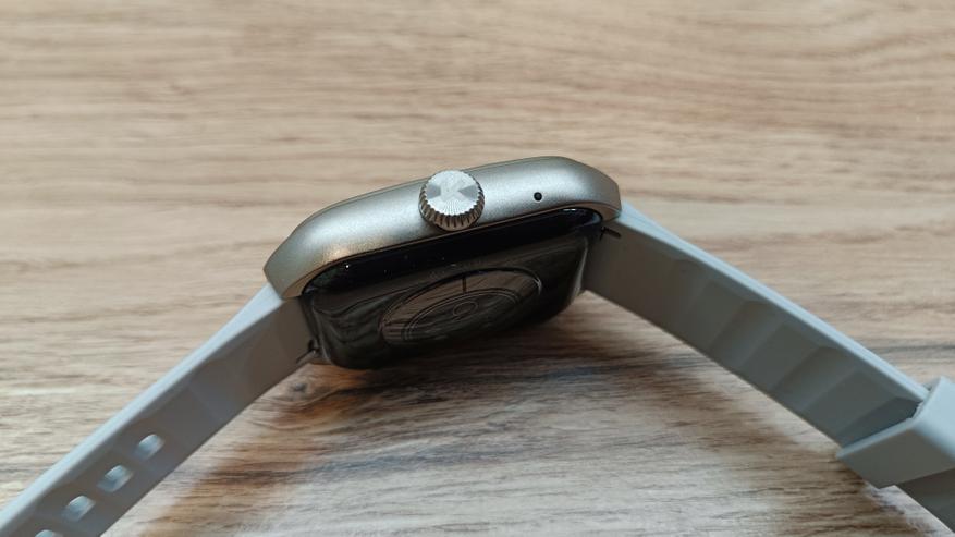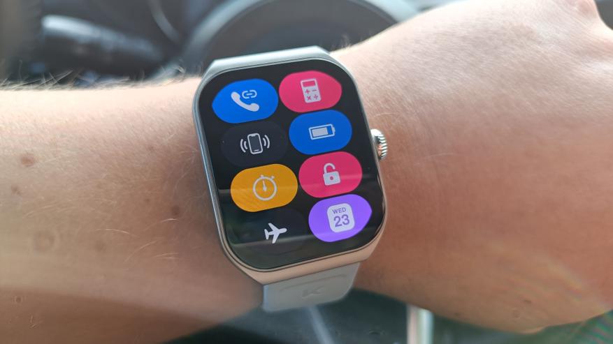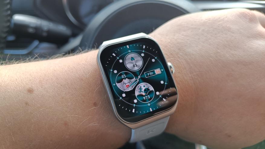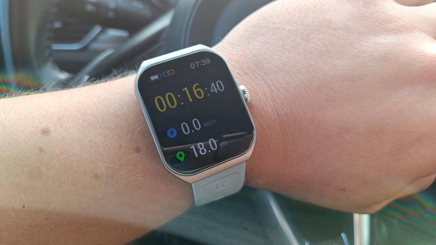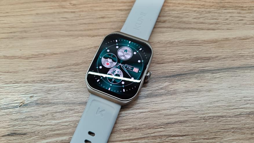 Смарт-часы Kumi KU7 в классическом прямоугольном корпусе, но само стекло имеет выраженную дугу. На стекле присутствует довольно хорошее олеофобное покрытие. Отпечатков пальцев почти не заметно, а вода группируется в капли и моментально скатывается. Под защитным стеклом размещается 1,96 дюймовый Amoled экран с разрешением 410*502. Цвета сочные и хорошо видны в яркую солнечную погоду.