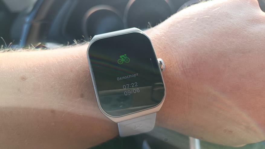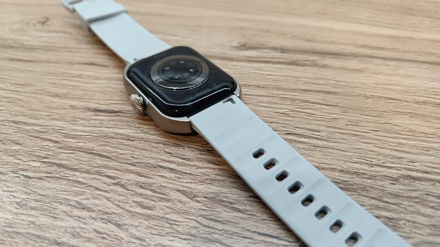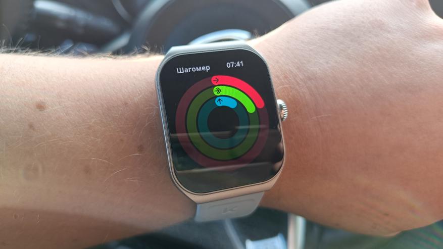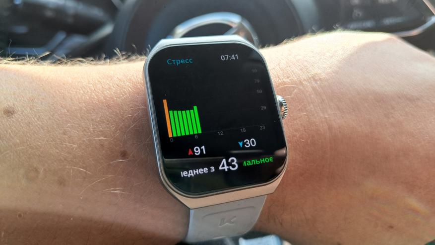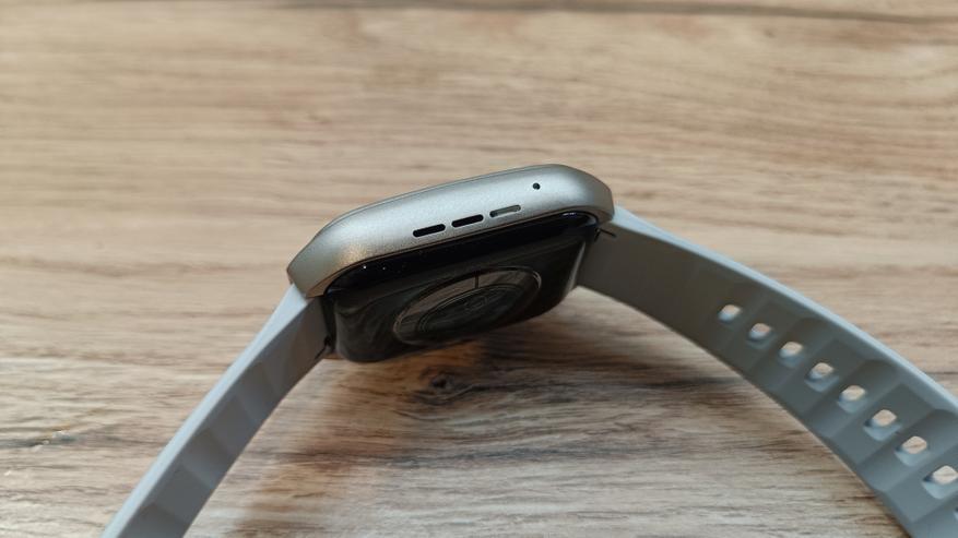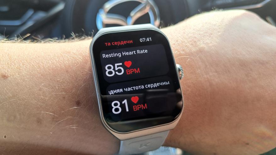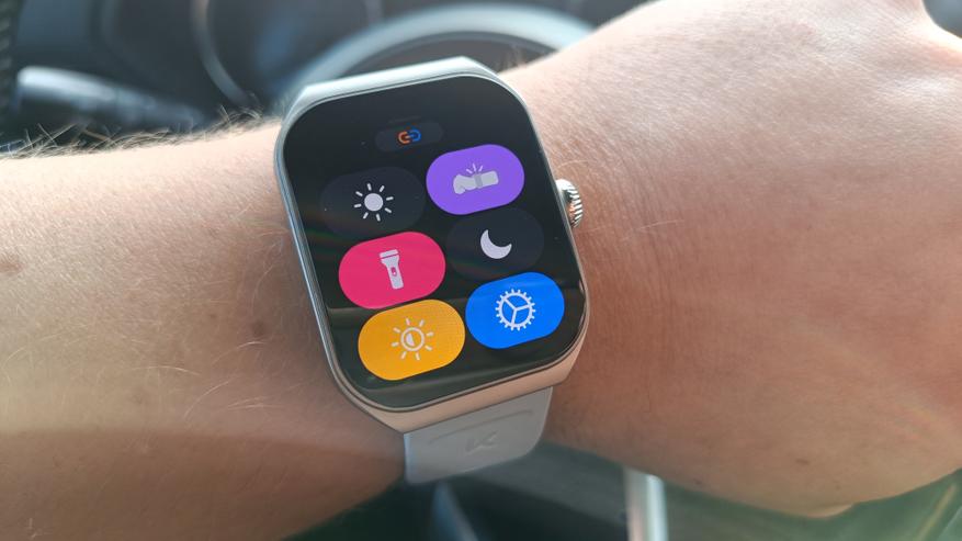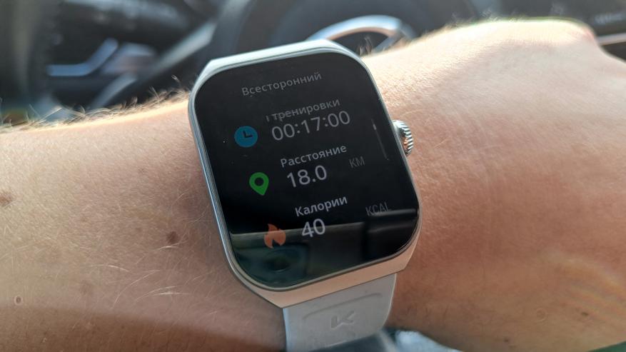 Смарт-часы Kumi KU7 в классическом прямоугольном корпусе, но само стекло имеет выраженную дугу. На стекле присутствует довольно хорошее олеофобное покрытие. Отпечатков пальцев почти не заметно, а вода группируется в капли и моментально скатывается. Под защитным стеклом размещается 1,96 дюймовый Amoled экран с разрешением 410*502. Цвета сочные и хорошо видны в яркую солнечную погоду.