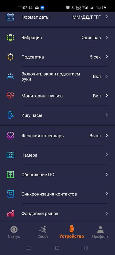 Менюшки на смарт-часах в стандартном исполнении. Так как нет второй кнопки, то спортивные функции запрятаны глубоко в настройках, но до них добраться можно. Переключение и выбор производится свайпами в различных направлениях. А подтверждение обычным нажатием. Переход на уровень выше при нажатии на кнопку или смещение экрана слева на право.