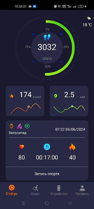 Второе окно предусмотрено для запуска спортивных режимов. В данном случае будет использоваться GPS смартфона.