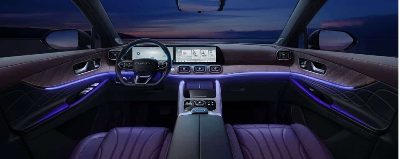 Chery Tiggo 9 2025 года оснащается D-образным рулевым колесом, приборная панель и центральный экран работают благодаря Qualcomm Snapdragon 8155. На выбор доступны как пятиместная компоновка салона 2+3, так и семиместная 2+3+2.
