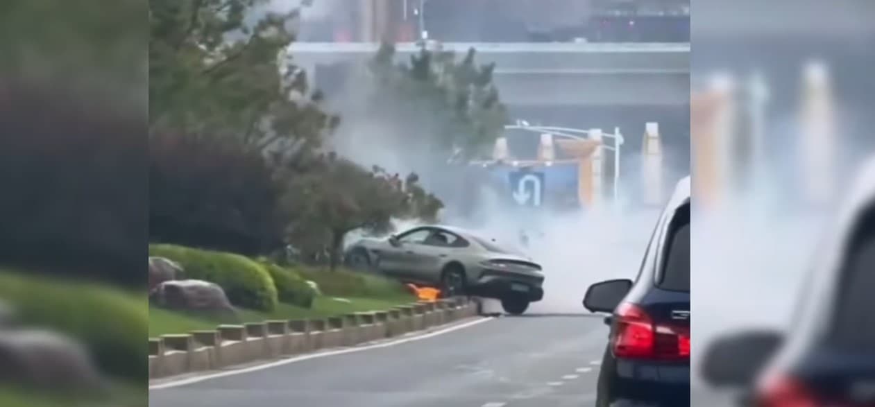 Зафиксирован первый случай возгорания электромобиля Xiaomi SU7, который выехал за пределы дороги, как показано в следующем ролике.