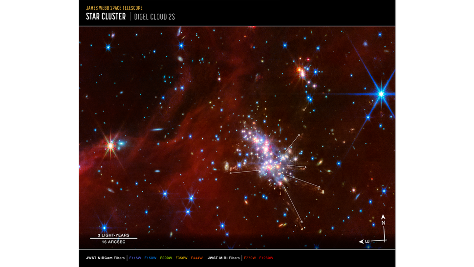 В 2S астрономы наблюдали плотную и активную область молодых звёзд, испускающих длинные струи материала из своих полюсов. Команда также смогла различить присутствие субкластера звёзд в 2S. «Изучая другие близлежащие регионы звездообразования, мы знаем, что звёзды, формирующиеся на ранней стадии своей жизни, начинают выбрасывать струи материала на своих полюсах. Что меня завораживает и поражает в данных JWST, так это то, что из этого скопления звёзд в разных направлениях вылетают многочисленные струи. Это немного похоже на фейерверк», — рассказал Майк Ресслер из Лаборатории реактивного движения NASA в Южной Калифорнии, член исследовательской группы и главный исследователь программы наблюдений.