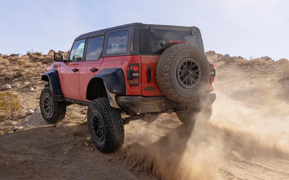 Помимо доработанной подвески у Bronco Raptor облегченный кузов за счет более широкого использования алюминиевых деталей, «зубастая» резина и 3,0-литровый турбомотор V6, выдающий 424 л.с. Двигатель сочетается с 10-ступенчатой автоматической коробкой передач, а привод, естественно, полный. Bronco Raptor может буксировать прицеп массой 2 тонны — на 450 кг больше, чем может обычный Bronco.