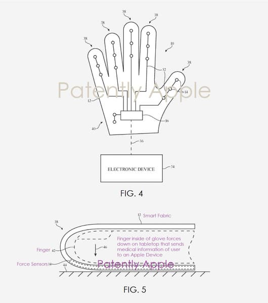 Американское патентное бюро опубликовало три патентные заявки от Apple, которые касаются «умных» тканей. В наиболее интересной из них описана перчатка с интегрированными датчиками, рассчитанная на работу совместно с устройством Apple Watch или Apple iPhone. Список возможных датчиков включает датчики артериального давления, дыхания, сердечного ритма и т.д.